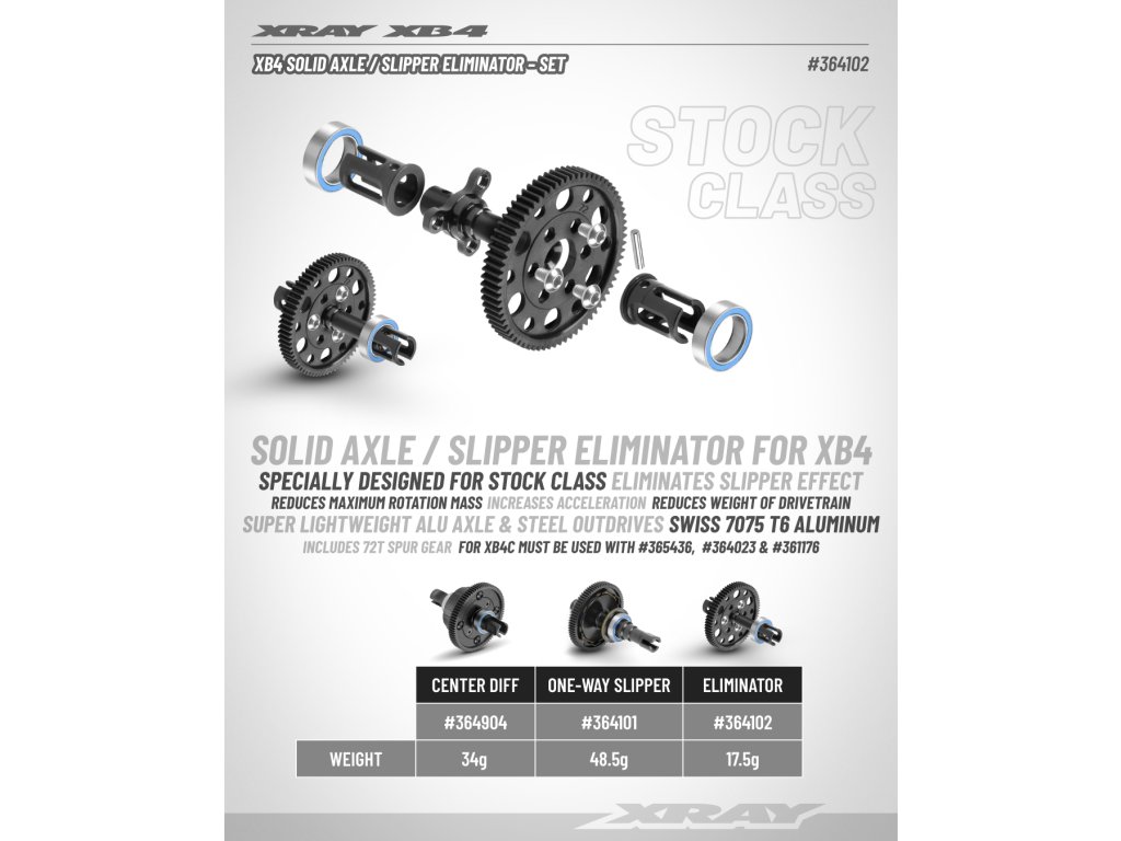 XB4 solid axle – slipper eliminator is great for stock class racing as it helps to reduce maximum rotation mass and eliminates slipper effect. Helps to increase acceleration and to reduce weight of drivetrain.