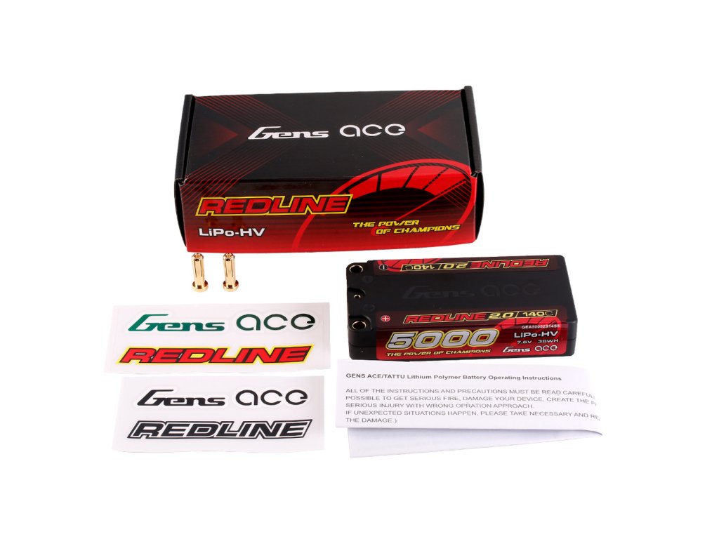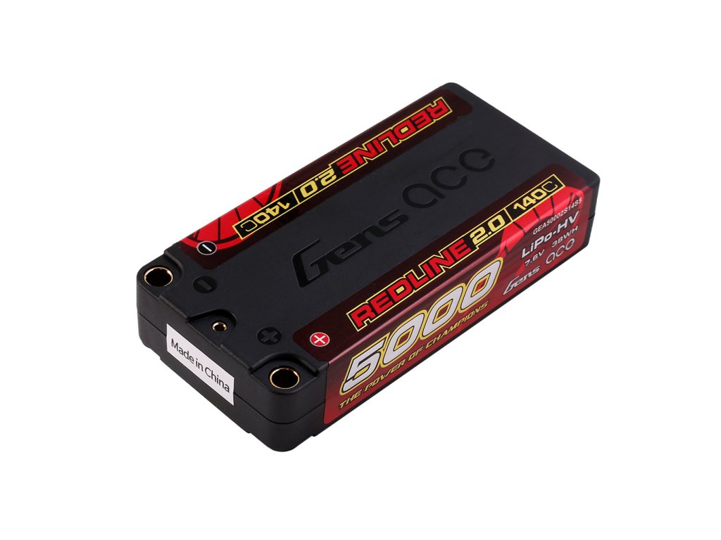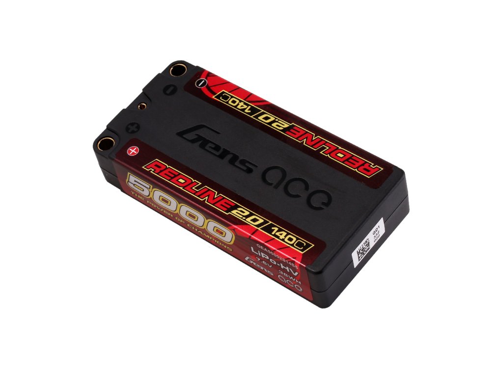 Gens ace Redline 2.0 Series 140C 5000mAh 2s Hardcase LiPo Battery Pack, with a factory installed 5.0mm bullet. Consumers trust the Gens ace name to deliver the dependability and high performance they expect. The Gens ace Redline LiPo battery pack has a high-capacity, high-discharge rate that gives you the power and run-time you expect.